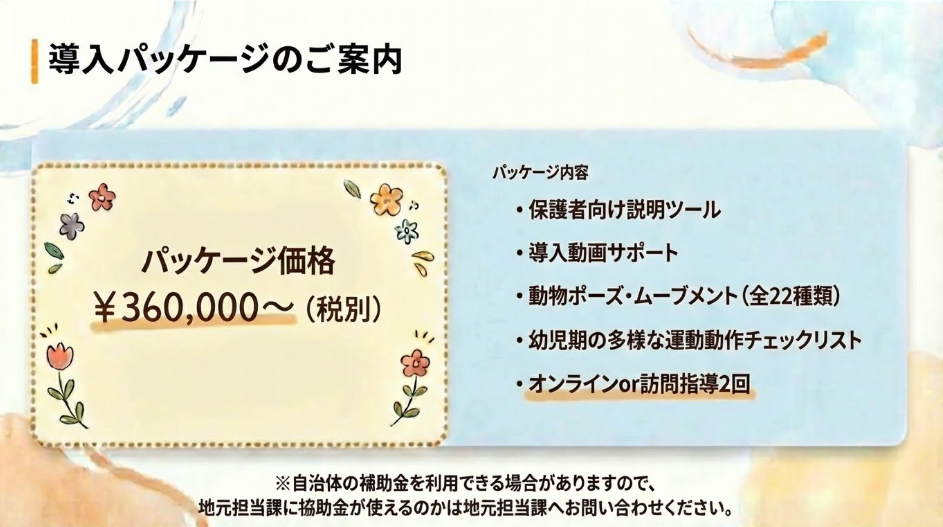 - 子どもロコモ予防に直結する遊びや運動を、日々の保育に無理なく取り入れられるようアドバイス