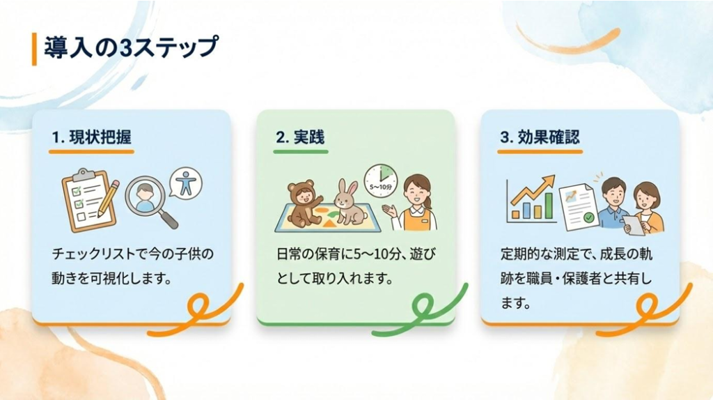- 職員が「動きの専門家」の視点を持つことで、園全体の支援力が向上